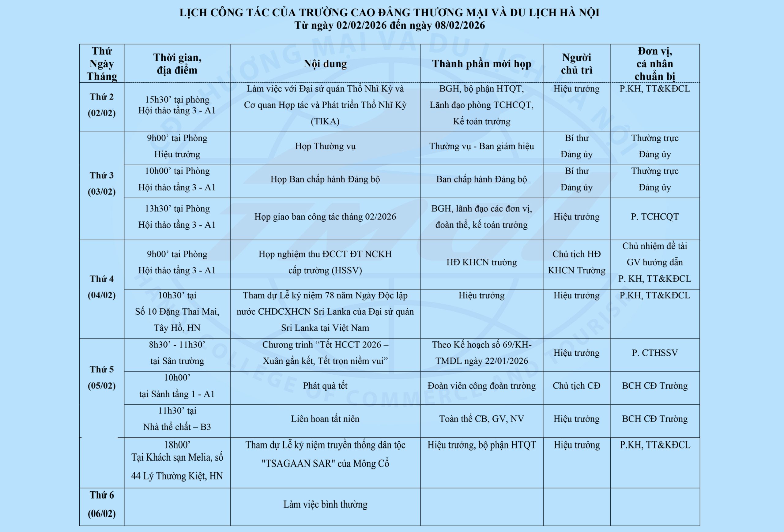 Trường Cao đẳng Thương mại và Du lịch Hà Nội thông báo lịch công tác tuần từ ngày 02/02/2026 đến ngày 08/02/2026