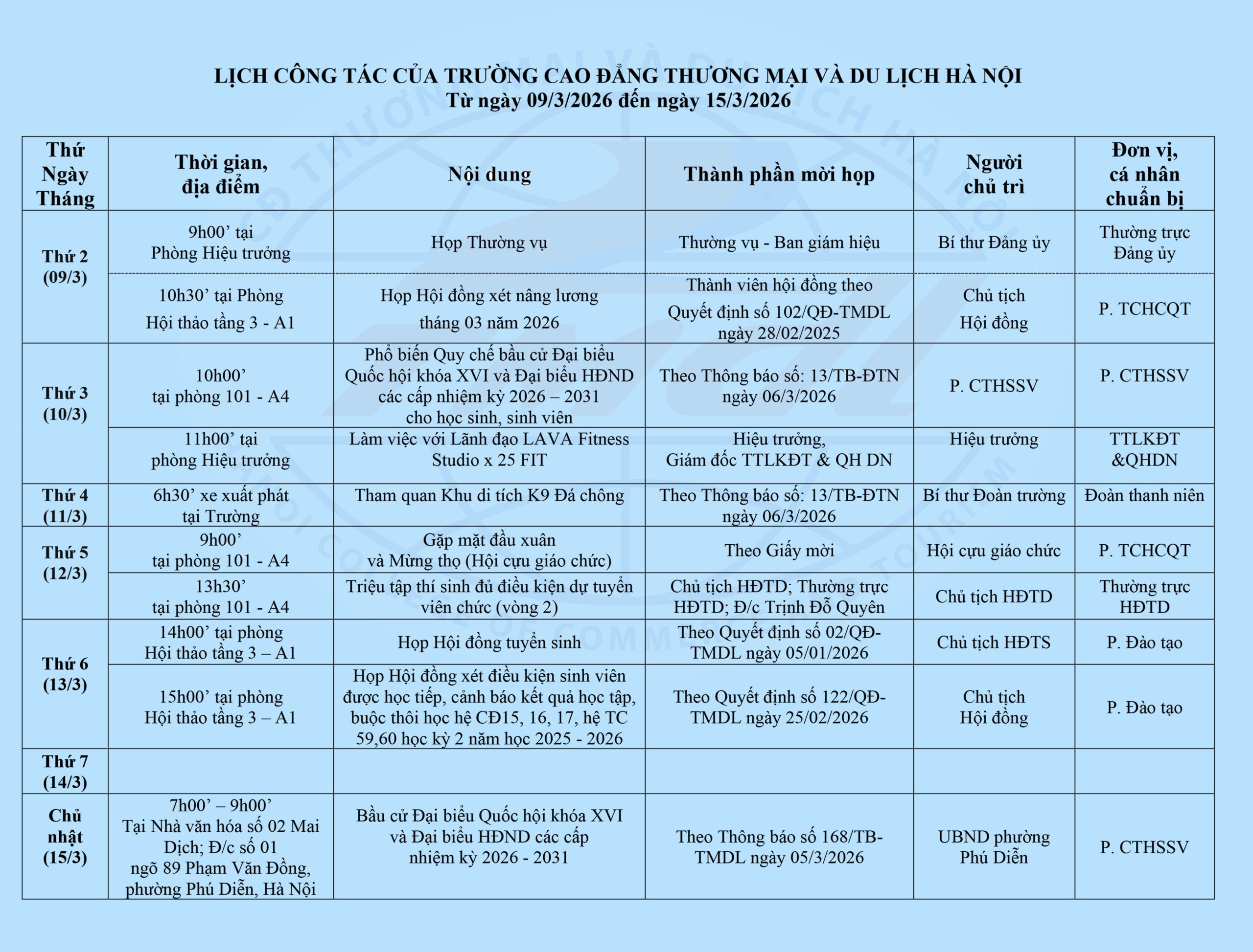 Trường Cao đẳng Thương mại và Du lịch Hà Nội thông báo lịch công tác tuần từ ngày 09/3/2026 đến ngày 15/3/2026