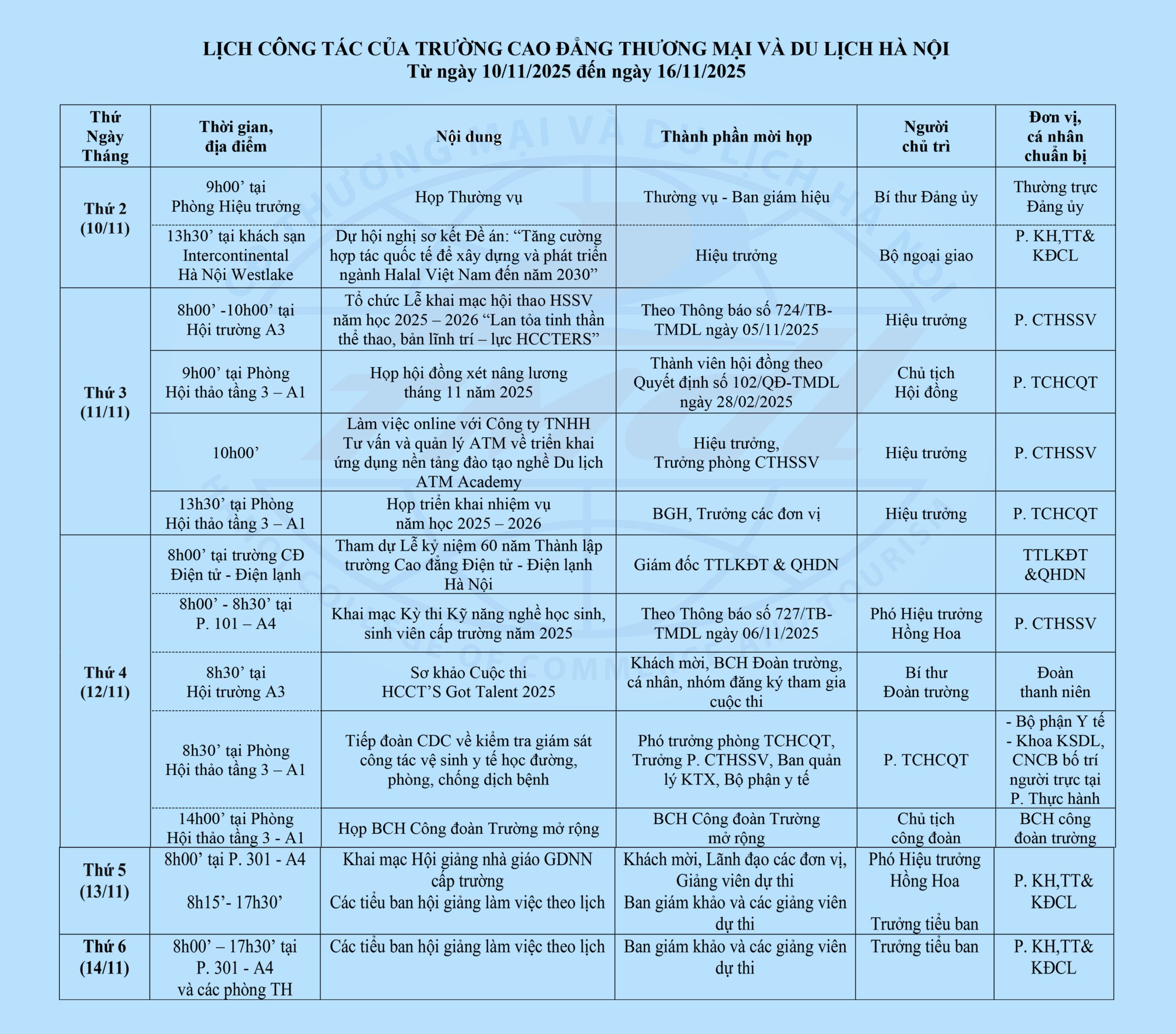 Trường Cao đẳng Thương mại và Du lịch Hà Nội thông báo lịch công tác tuần từ ngày 10/11/2025 đến ngày 16/11/2025.