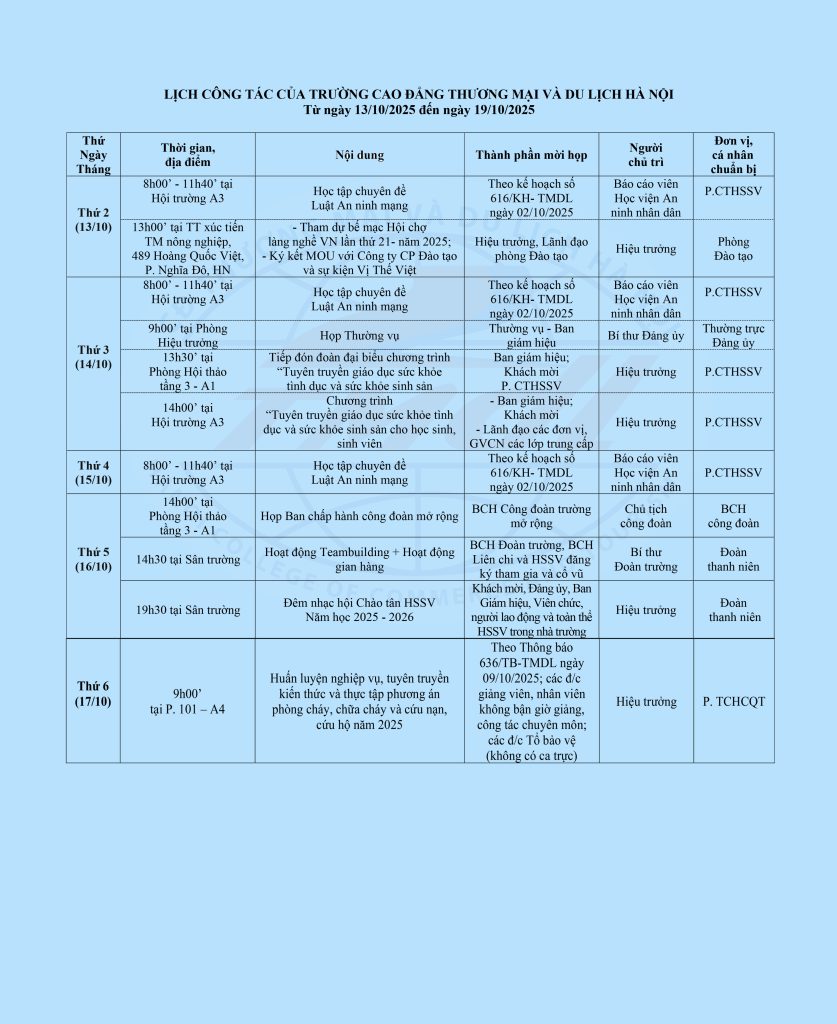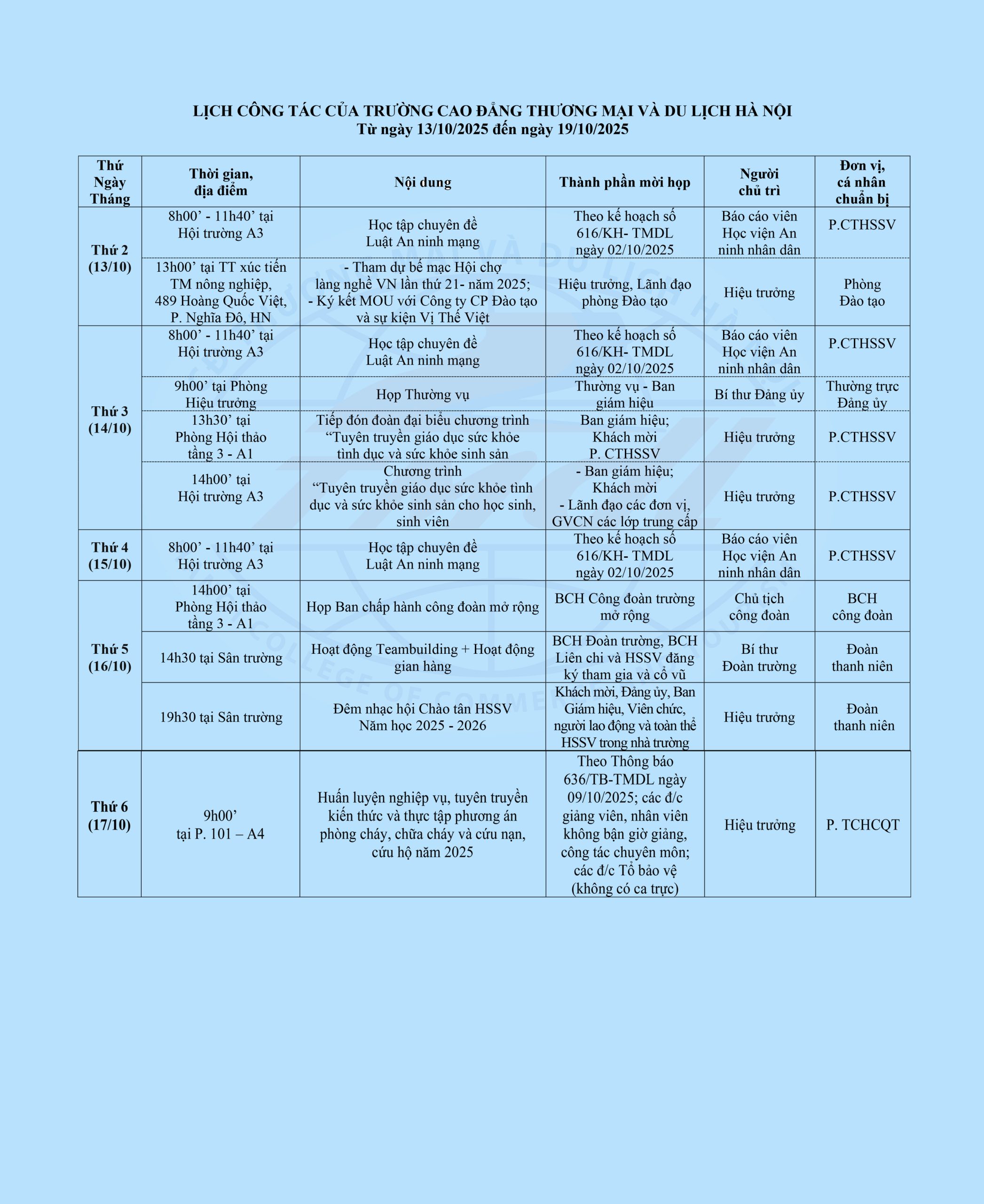Trường Cao đẳng Thương mại và Du lịch Hà Nội thông báo lịch công tác tuần từ ngày 13/10/2025 đến ngày 19/10/2025.