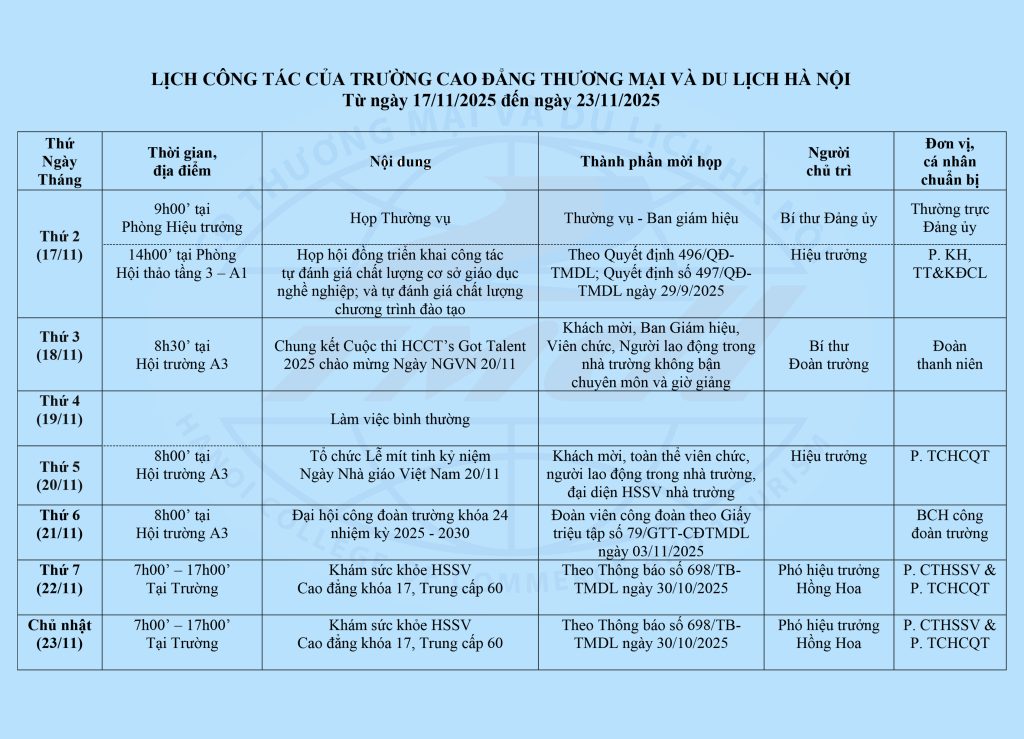 Trường Cao đẳng Thương mại và Du lịch Hà Nội thông báo lịch công tác tuần từ ngày 17/11/2025 đến ngày 23/11/2025.