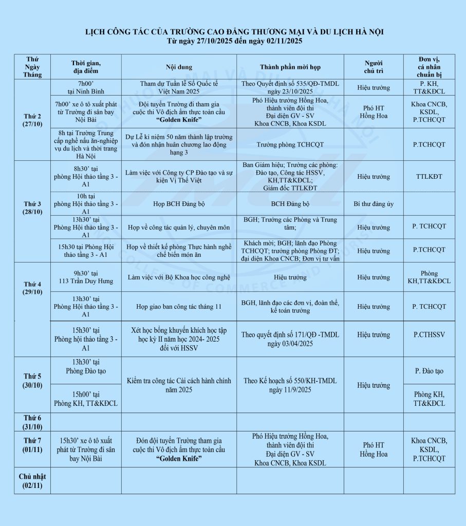 Trường Cao đẳng Thương mại và Du lịch Hà Nội thông báo lịch công tác tuần từ ngày 27/10/2025 đến ngày 02/11/2025.
