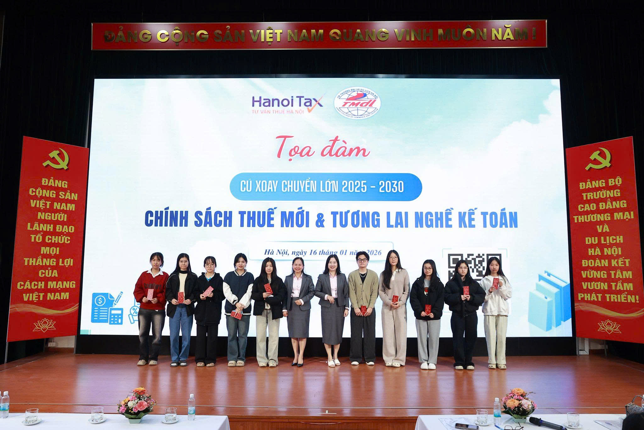 Về phía Nhà trường, có TS. Trịnh Thị Thu Hà, Bí thư Đảng ủy, Hiệu trưởng; ThS. Nguyễn Hiếu, Phó Hiệu trưởng Nhà trường; đại diện lãnh đạo các khoa, phòng thuộc trường; cùng hơn 200 sinh viên tham dự tọa đàm.